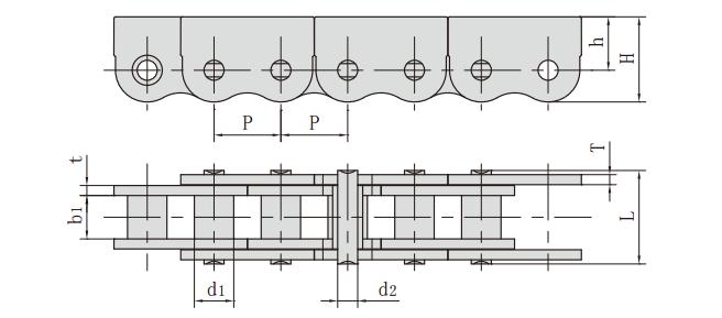鏈條型號 節(jié)距 滾子直徑 內(nèi)節(jié)內(nèi)寬 銷軸直徑 銷軸長度 鏈板尺寸 抗拉強度 每米長重
