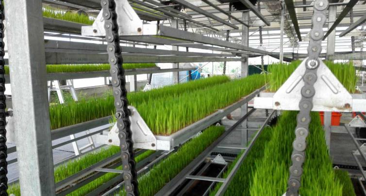 該設備采用多層,多組連體式的育苗盤排列結合通過鏈條循環方式來保障和變換采光,由傳統育秧盤平鋪式、貨架式固定布置,創新為鏈條循環運轉式,充分發揮立體空間作用;而智能噴霧保溫保濕、施肥與施藥設施固定布置,配合勻速循環運行通過的育苗盤,通過系列自動化設施與測試監控設施輔助保證通風光照、溫濕度等作物育苗環境條件,從而降低操作工人勞動強度和提高生產效率。