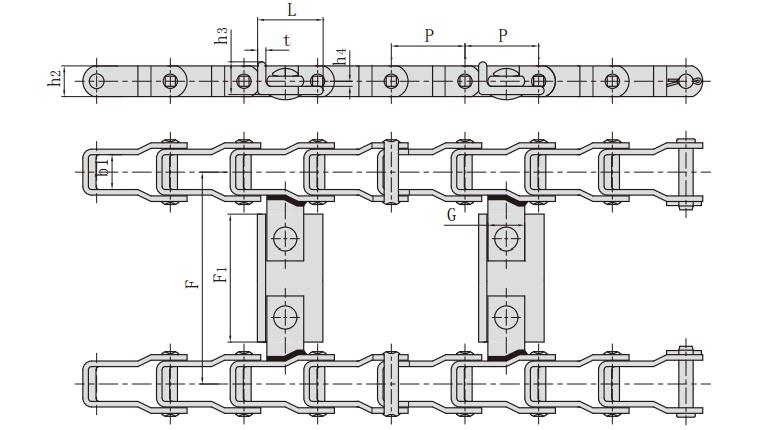 鏈號(hào) 節(jié)距 內(nèi)節(jié)內(nèi)寬 鏈板高度 附板尺寸 抗拉強(qiáng)度